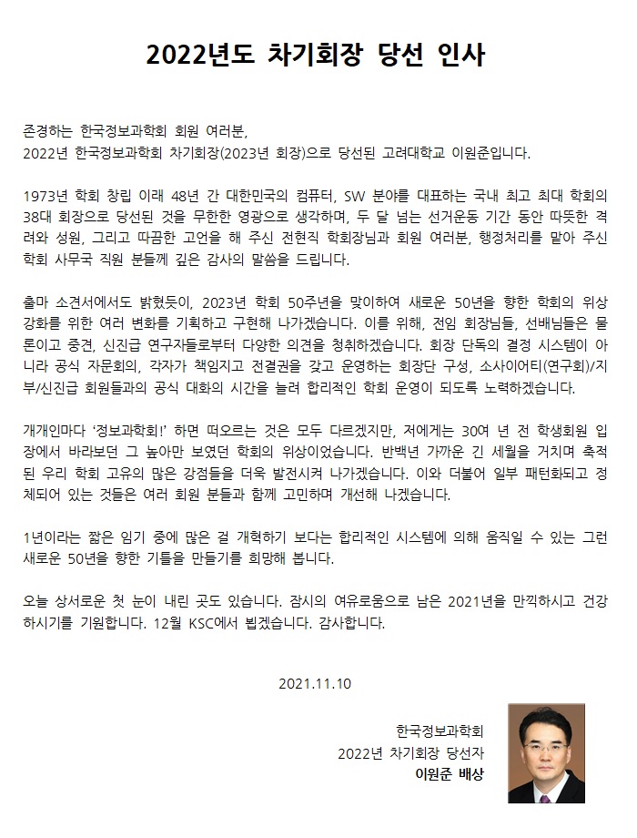 Professor Wonjun Lee has been elected as the 2022 KIISE President-Elect.